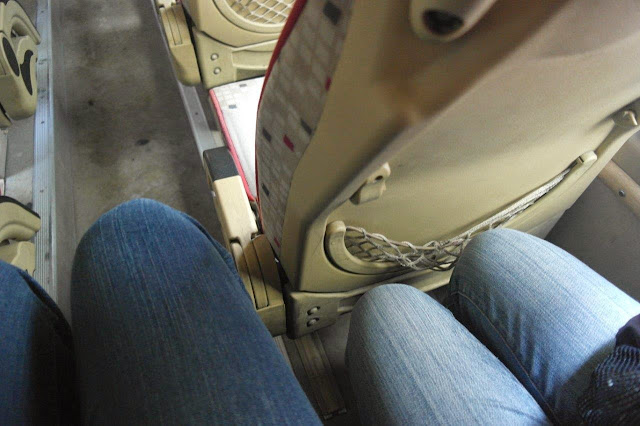 | Primeira vez que a Lud viaja com o joelho batendo na cadeira da frente. Eu só consegui caber na van porque fui no assento do final do corredor. |