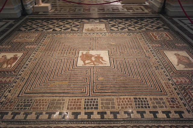 | O mosaico mostra o labirinto do Minotauro em Creta. Teseu tá lá (e Ariadne também, do lado fora à direita). |