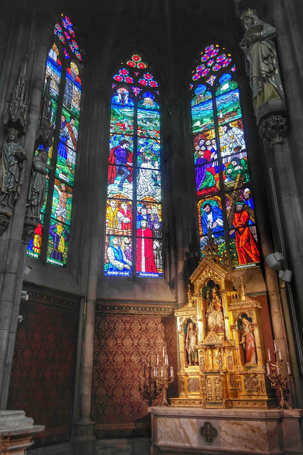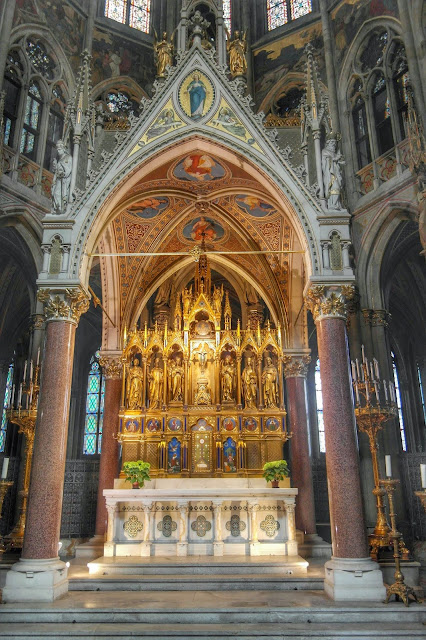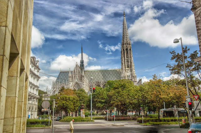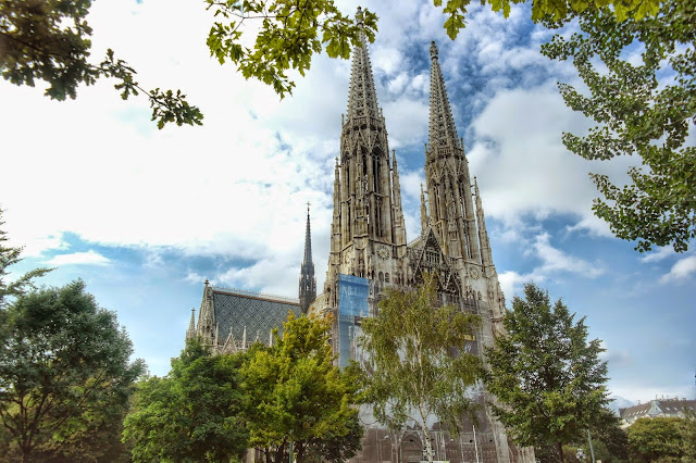 Para mim, o pacote completo é a Katholisches Pfarrmant Votivkirche. Linda de chorar por fora. Está quase toda limpinha e é de uma brancura incrível. Por dentro pode não ser tão bela como a de São Pedro, mas tem seu charme. Para nós, o principal é que ela é super acolhedora e receptiva. Tem menos turista, é de graça, pode tirar fotos a vontade e ainda pode de entrar de chinelo e bermuda. E nela tem missa em tudo que é língua, do português ao armênio.