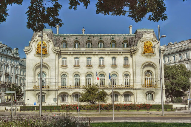 E, para terminar, a embaixada da França. Ela sempre escolhe uns predinhos legais para se instalar. Em tudo que é país por que a gente passa, é uma construção bonita com estilo meio parisiense. Aí é só chegar perto para ver uma bandeira francesa e a placa falando que é embaixada.